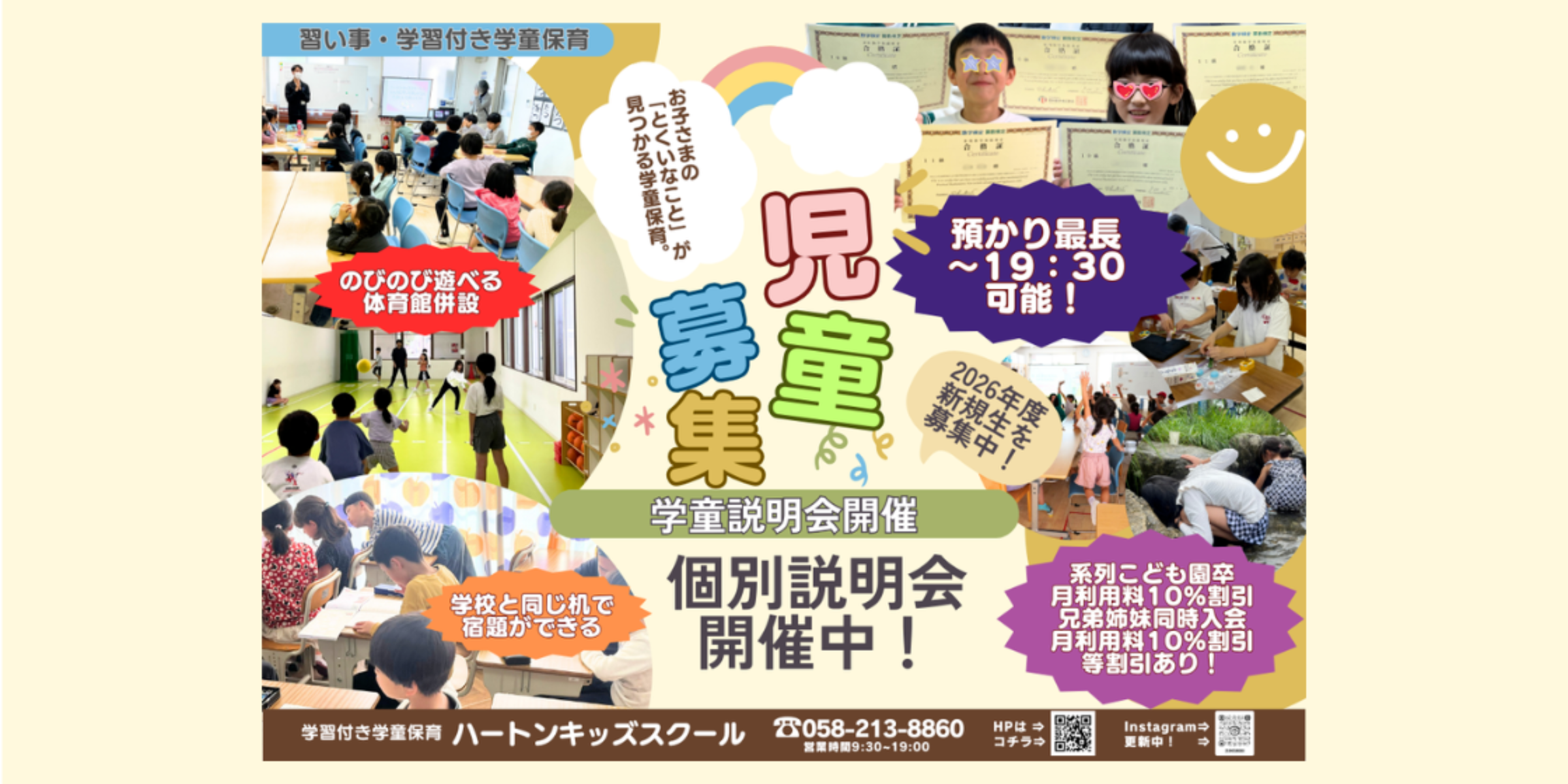 岐阜市の学習付き民間学童保育「ハートンキッズスクール」のサイトへようこそ。